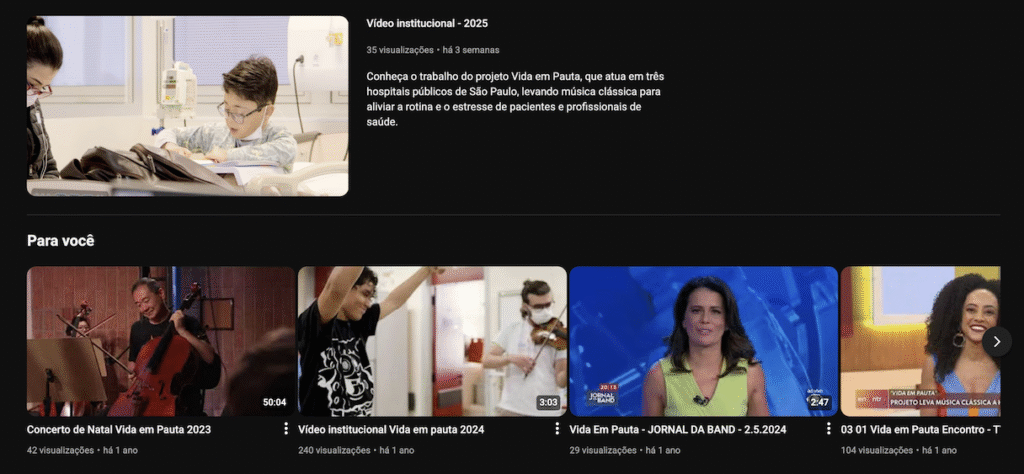 O projeto Vida em Pauta é uma iniciativa que leva música clássica a hospitais públicos. Apresentando-se em formações intimistas, como duos e trios, os músicos do projeto buscam levar momentos de conforto a pacientes que passam por longos e penosos tratamentos de saúde. As apresentações do Vida em Pauta percorrem espaços de geriatria, oncologia, pediatria, psiquiatria, de cuidados paliativos, hospitais dia, pronto socorros, ambulatórios, além de outros diversos ambientes hospitalares, permitindo que pacientes, acompanhantes e profissionais da saúde possam desfrutar da música onde quer que estejam. Todas as atuações musicais ocorrem em parceria com a equipe hospitalar: os músicos são preparados para compreender o contexto dos hospitais e recebem orientações específicas para interagir de maneira eficiente e respeitosa com pacientes e familiares.